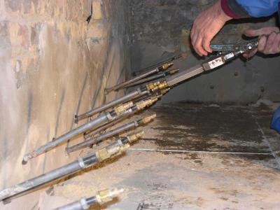 Furatokat készítünk 12 - 14 cm távolságra a padló szint felett és nagynyomású csöveken ( pakkereken ) keresztül 1-300 bar nyomással beinjektáljuk.
